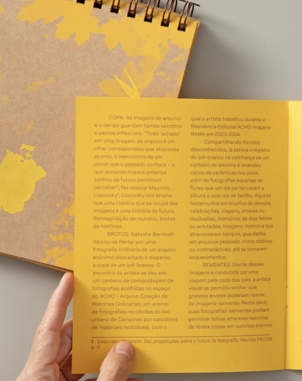 Natasha Barricelli deixou-se flertar por uma fotografia ordinária de um arquivo anônimo descartado e disperso: a copa de um ipê-branco. O encontro da artista se deu em um canteiro de compostagem de fotografias acolhidas no espaço do ACHO – Arquivo Cole ao de Histórias Ordinárias, um acervo de fotografias recolhidas do lixo de materiais recicláveis, com o qual a artista trabalhou durante a Residência Editorial ACHO.